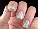 This look is so versatile that you really can go to any extreme. For my look, I’m choosing a soft mixture to coordinate with the spring season. I chose American Apparel Office as my base color. For the glitter, I used China Glaze Glistening Snow and FingerPaints Santa’s Magic. You want to pick a fine glitter color that has enough glitter to be opaque in two or three coats. You can leave it at that or choose another glitter that has chunkier bits and carries less glitter in the base. I chose one of each for my look.